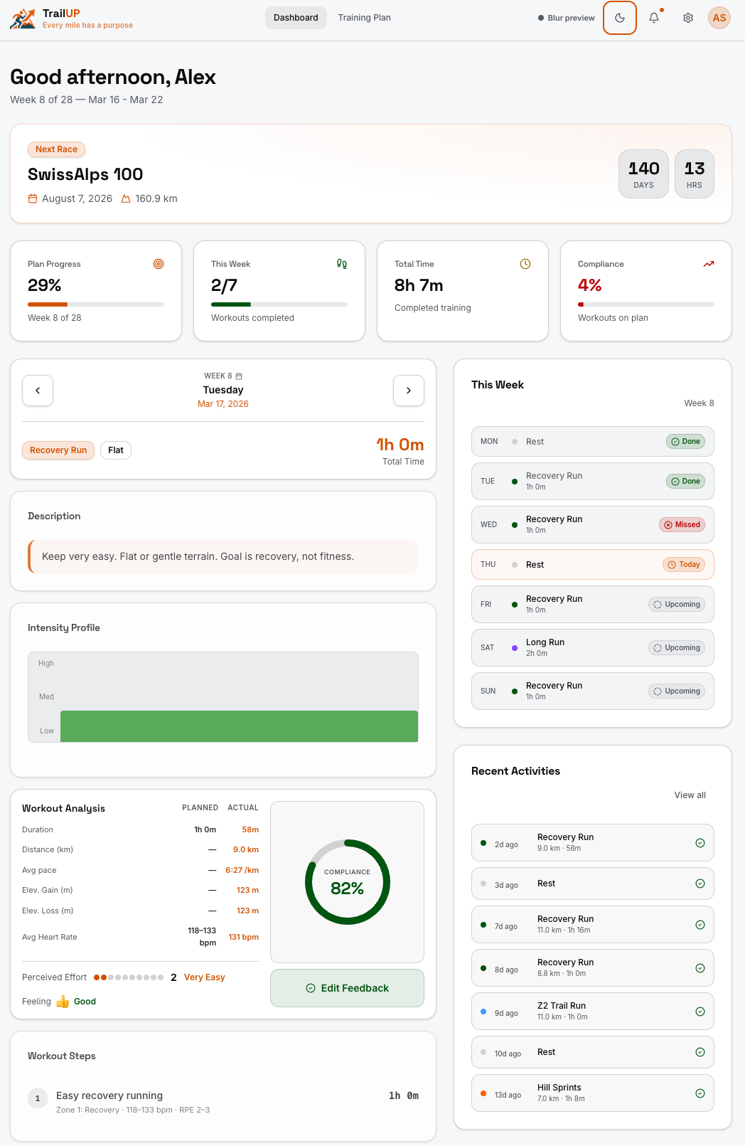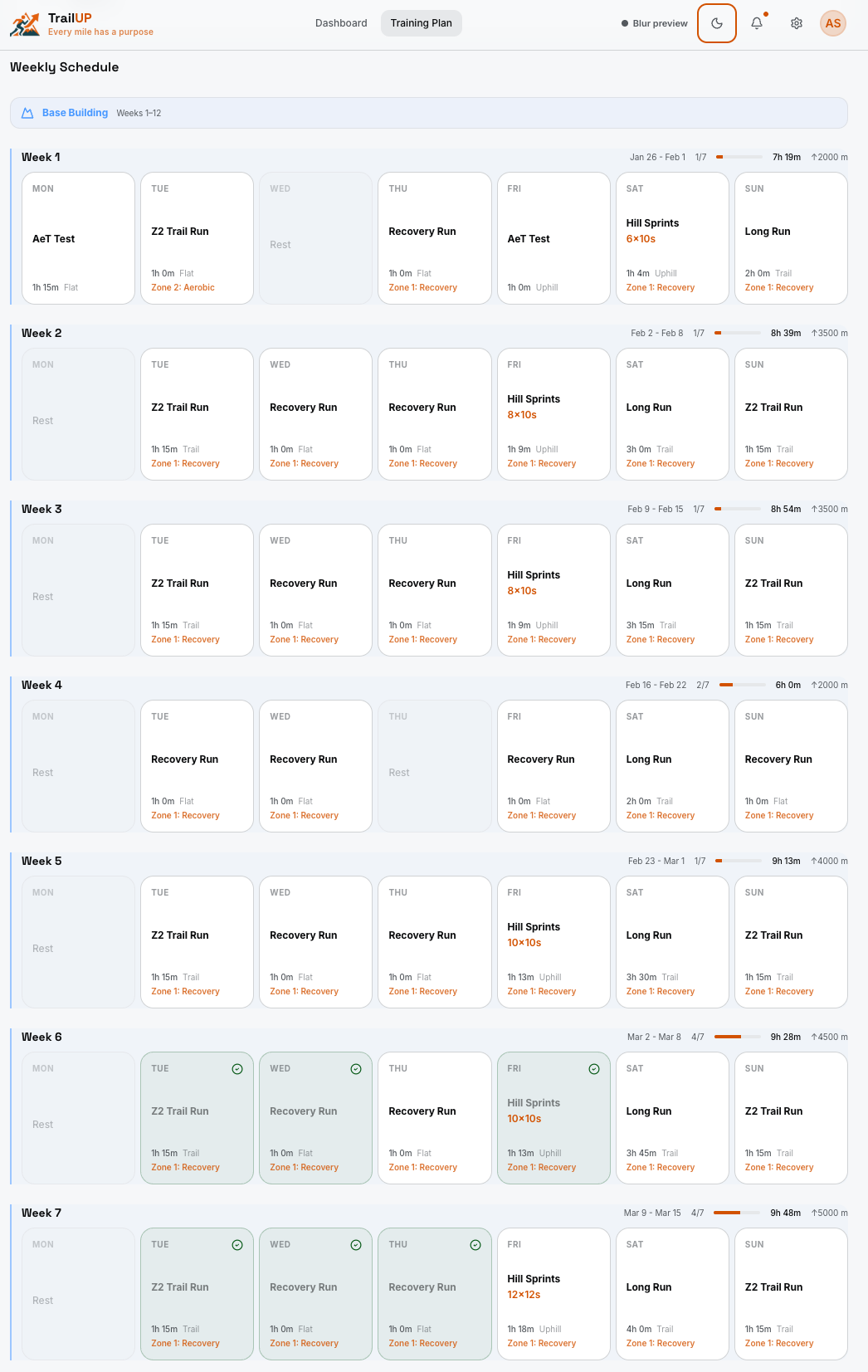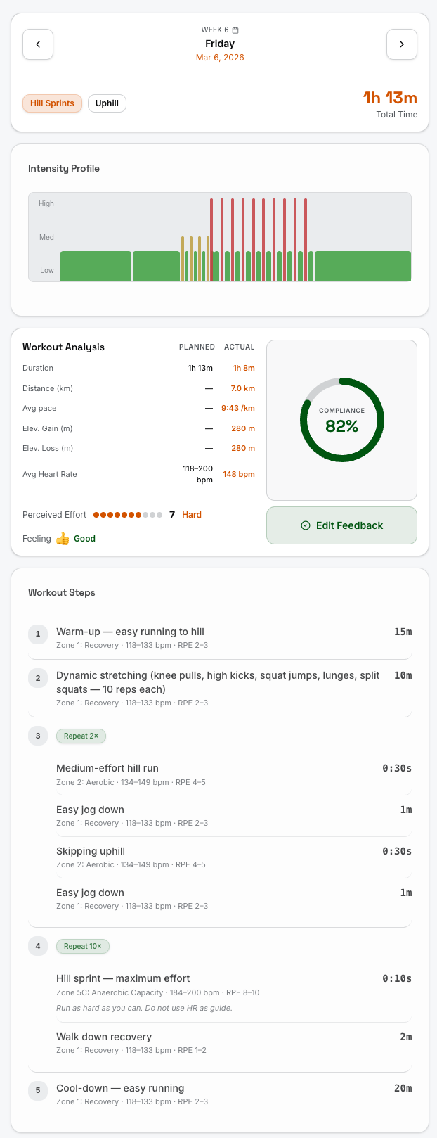 See exactly what to do each day — warm-up, intervals, cool-down. Each step has duration, intensity targets, and terrain guidance.