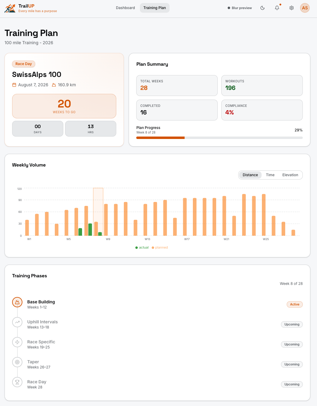 Live countdown to race day. Track plan compliance, weekly volume, and training phases from Base through Taper.
